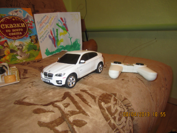 это машинка на пульте управления, с фарами и стопами мигающими, когда едет, Арсюшка был в восторге))) что они горят когда машинка едет))