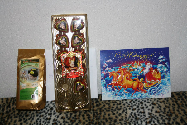 ... и о нас с мужем не забыла Настюша))) мне кдлассный чай - УЛЫБКА ГЕЙШИ, а папе конфеты... Подозреваю, что и конфеты были мне, но папе сказала, что ему))) я сладкое после 12 дня не ем)))))))))