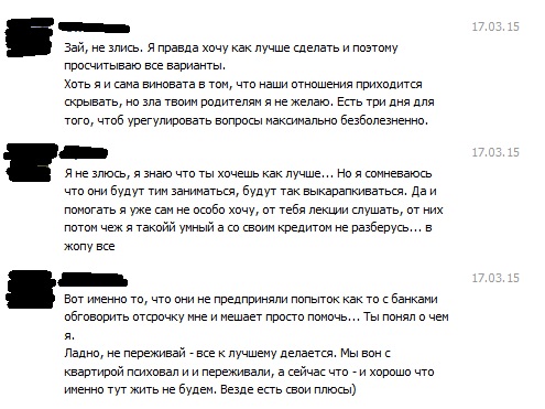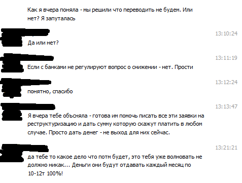 Я предлогала писать письма в банки на реструктуризацию, пытатся уеньшить платеж всеми силами и готова была сама им эти письма составлять (опыт есть, весьма успешный и муж об этом вкурсе!). Сказала четкое - я дам ту сумму, которую банки обяжут в любом случае оплатить именно сейчас! Только так!
