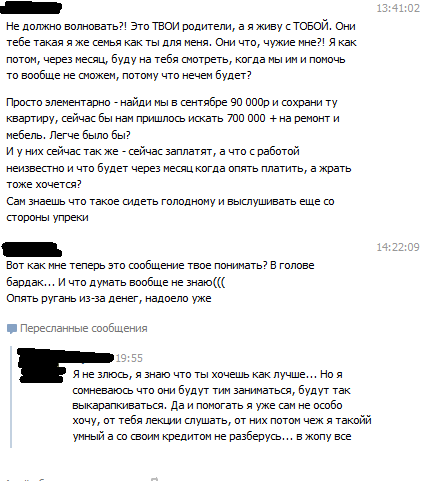 Я с самого начала говорила о том, что нужно создавать подушку безопасности и просчитывать вперед - чем платить, что платить и кому. Две недели муж вроде как общался со свекрами на эту тему (да, я в этом сильно сомневаюсь что он хоть чтото им предложил и сказал, из того что говорила ему я), но никакого результата - просилась сумма и приводились доводы, половину их которых я отправила в мусор.