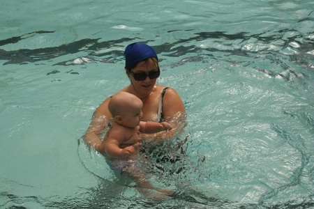 Я в своей жизни плавала только в двух морях- Средиземном и Красном. Красное море от меня далеко :))) А Средиземное море очень бурное, там часто бывают высокие волны, и только считанные дни в году погода позволяет зайти в море поглубже вместе с ребенком, скажем, по грудь. Я бы не рисковала и не заходила глубоко с младенцем. Соня купалась в море- именно плескалась на мелкоте с 5 месяцев. И только к году мы стали вместе плавать "заспинным" способом, и то не каждый раз, из-за волн. Таким образом, плавание в море у нас получилось очень условное, в отличие от бассейного.