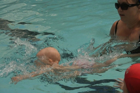 Дополнительно, можно учить нырять. Если вы не уверены, что "чувствуете спиной", буквально, дыхание своего малыша, то начните ныряния лицом к лицу. Есть один трюк, чтобы ребенок задержал дыхание - надо ощутимо подуть ему в лицо. Итак, этап первый - дуем в лицо и брызгаем на него водой. Затем дуем в лицо и поливаем его из ладони. Вы видите, что ребенок адекватно относится к этим действиям?- переходите к ныряниям. Дуем и быстро ныряем, вместе с ним. Первые разы малыш в сомнениях, - что это новое? плакать или нет? Тут важна ваша реакция. Улыбайтесь и хвалите. Вообще, ваш внутренний положительный и уверенный настрой многое определяет. Так постепенно вы сможете нырять 2-3 раза подряд, и на более долгое время.