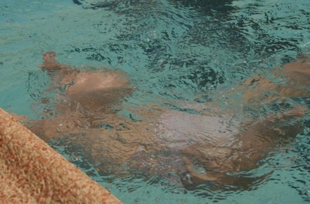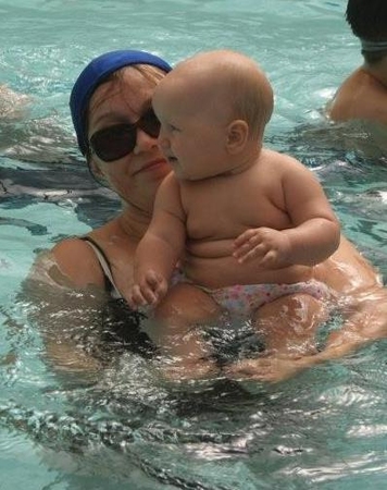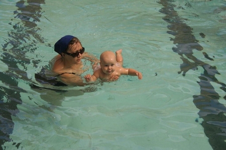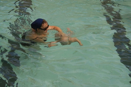 Далее, это именно аква-гимнастика, - она особенно полезна детям с моторными проблемами, а к плаванию, собственно, должно относиться только одно упражнение- учимся держаться у мамы за спиной. Соня научилась этому примерно в год, это довольно поздно. Виной тому я, - учила ее плавать отдельно от себя, а надо было проще, плыть вместе. Когда ребенок держится за спиной, он просто сидит на плывущей маме, плывет и ныряет вместе с ней. Это тоже не сразу происходит, надо очень чутко чувствовать ребенка, чтобы так плыть и нырять.