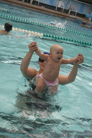 Если вы начинаете плавание с ребенком постарше, с года-двух, отличается тем, что малыш будет дольше привыкать к воде. С другой стороны, годовалый ребенок физически крепче, чем трехмесячный, и вполне может держаться за спиной у мамы или папы.