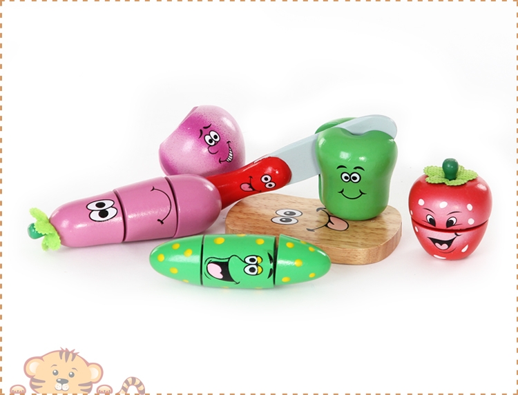 Упакованы в круглую коробку. В наборе - половинки овощей огурец, баклажен, перец, редиска, клубничка. И ножик, которым овощи можно будет резать.