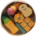 В наборе мороженое в рожке, тосты, масло, сыр, бутылка, ножик для разрезания и доска. Упаковано в круглую коробку.