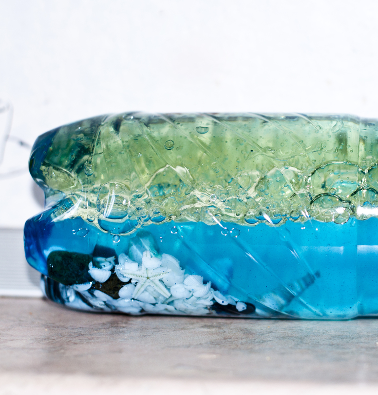 Ребенок, придя из сада и увидев эту бутылку, пришел в дикий восторг! Полчаса перекатывал камушки и ракушки по дну, любовался причудливыми волнами и пузырями.