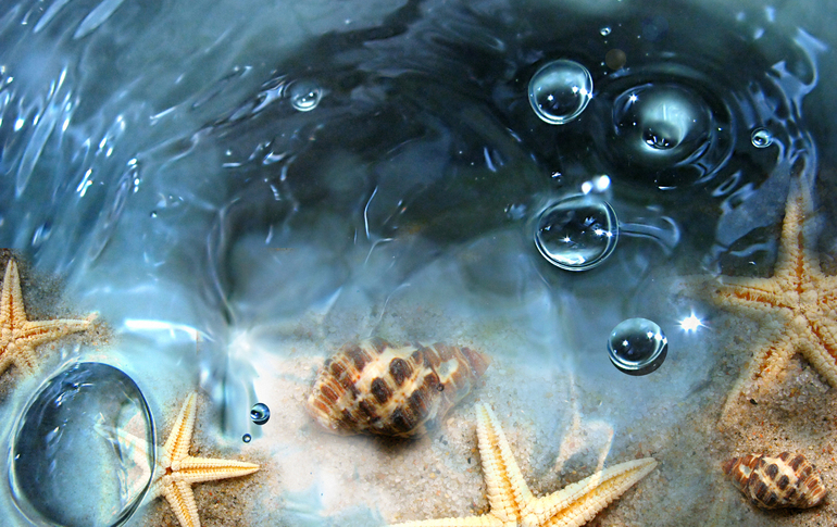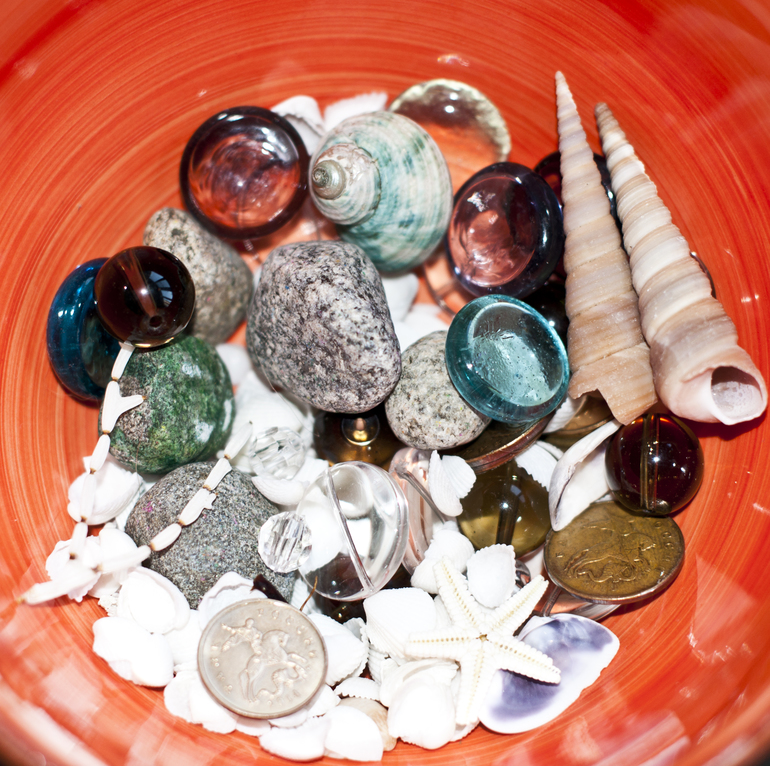 Наливаем в пластиковую бутылку немного кипяченой воды и наполняем ее «морскими» атрибутами: крупными бусинами, мелкими и крупными ракушками, монетками, предварительно окрашенными прозрачным лаком для ногтей (чтобы не окислились). Кроме того бросаем внутрь стеклянные камешки, мелкую гальку, светлый бисер и, если у вас есть мелкие фигурки морских животных. Доливаем в бутылку воду чуть больше половины сосуда, капаем одну капельку синего пищевого красителя , вливаем растительное масло, а также можно всыпать мелкие блестки (золотого, бронзового или серебристого оттенка).