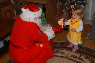 Вместе с Дедом Морозом мы потанцевали хоровод, Аня рассказала стишок, все вместе спели песенку про Елочку. Уже и подарков хочется :))))