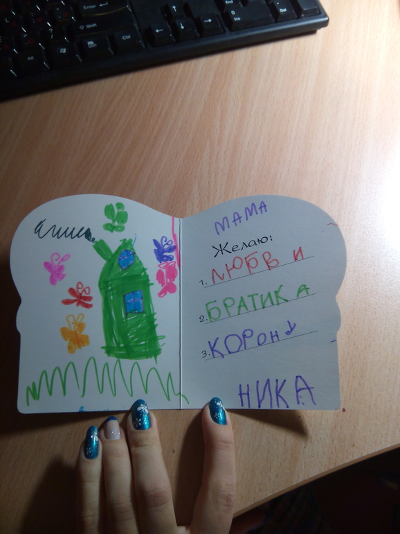 Доченька на днюху подарила букет и открытку, Боже.... мои эмоции зашкалили когда я прочитала пожелания.... Открытку клеила сама под контролем бабушки)