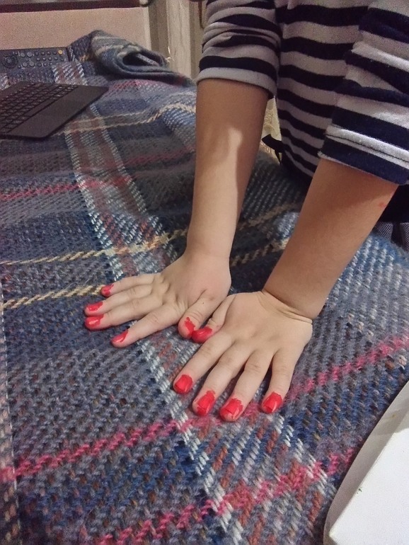 Ещё и не отмываются теперь, а нам завтра на занятия))) Как-то, давненько уже, где-то год назад, Оля нашла мой красный лак, и тоже намалевала себе ногти, это было повеселее оттирать, чем гуашь)