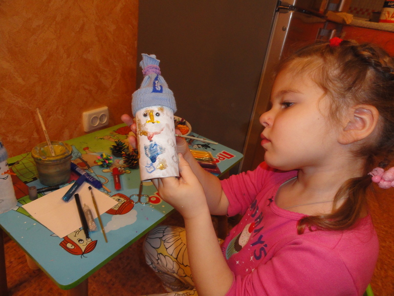 В перерывах, пока сохло, делали задания на зимнюю тему. Об этом нас попросил Дед Мороз, который прислал Кате письмо в ответ (в нем "фото" Деда с Катиным списком-письмом в руках) и все нужные для поделки детали (шишки, веточки, елочки, шапочки, глазки, карандаш-клей с блестками). Открыла у Кати новое увлечение - лабиринты. Раз 8 спускала детей с горки по лабиринту.