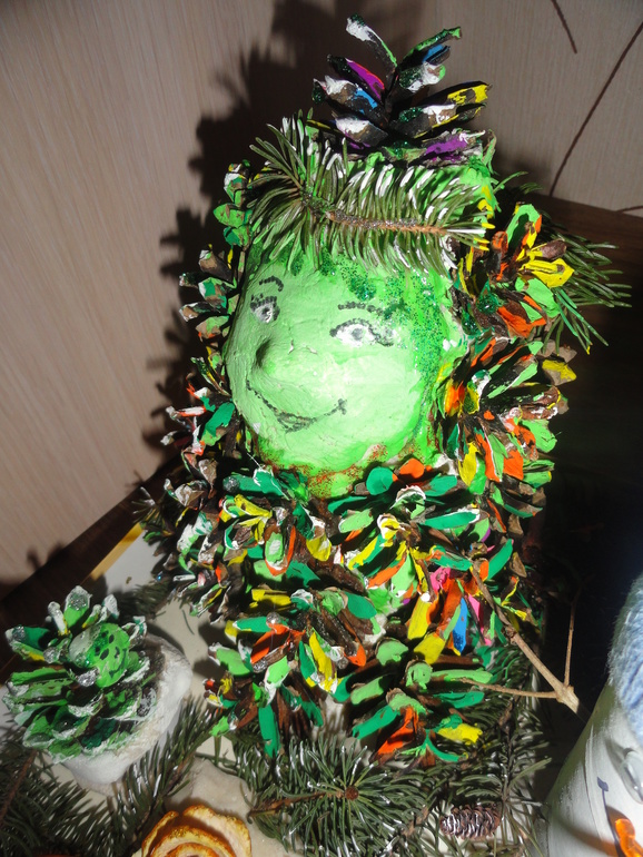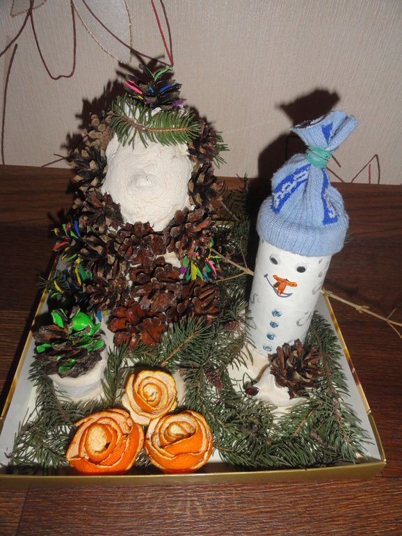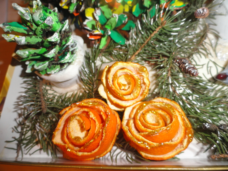 Еще Катя раскрашивала шишки и помогала облеплять рулончик тестом (основание для ёлки) и втыкать сами шишки, пыталась закручивать розочки из шкурки мандарин.. Процесс не фотала, т.к. были все в муке)))