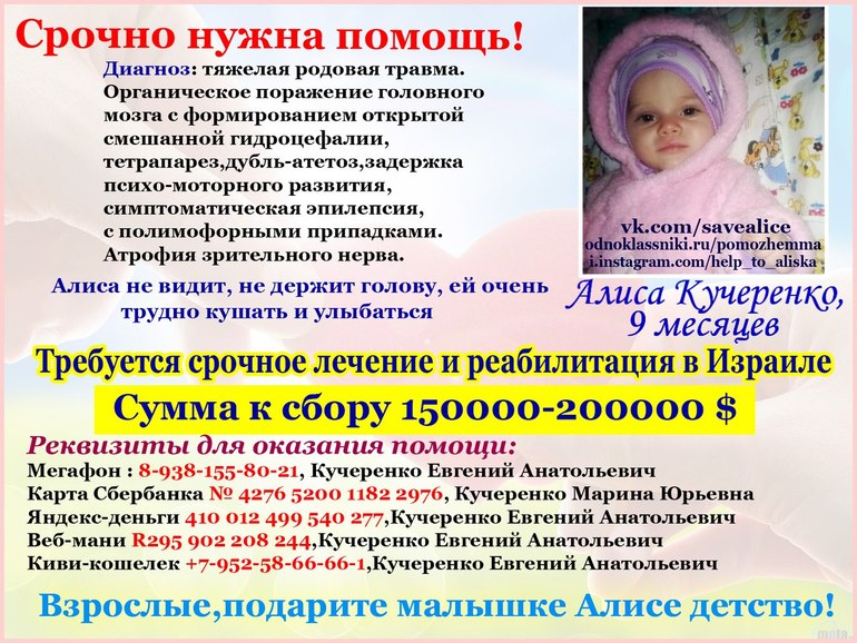 У каждого человека есть заветная мечта, которую он бережно хранит в своем сердце. Иногда эту мечту невозможно осуществить самому... Задумайтесь, как это здорово, когда вы являетесь тем человеком, который воплощает чью-то мечту в жизнь!!! Семья Кучеренко из Ростова на Дону очень мечтает подарить своему ребенку здоровое и счастливое детство! Но одним им не справиться в этой ситуации. Добрые сердца,не проходите мимо пожалуйста,давайте поможем обрести девочке счастливое и полноценное детство. У каждого из нас найдется 100,200 рублей без которых мы беднее не станем, а девочке они очень помогут. Ведь именно из таких не больших сумм,собираются огромные сборы. И мы сможем спасти чью то жизнь! Все документы и реквизиты есть в группе помощи Алисы ссылки ниже Ссылка на группу помощи в одноклассниках - http://ok.ru/pomozhemma в контакте - http://vk.com/savealice страничка мамы Кучеренко Маринаhttp://ok.ru/profile/552688811878