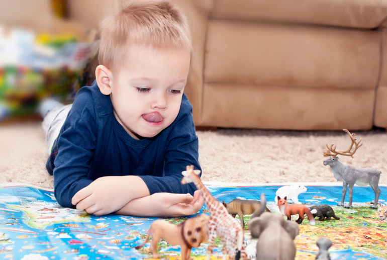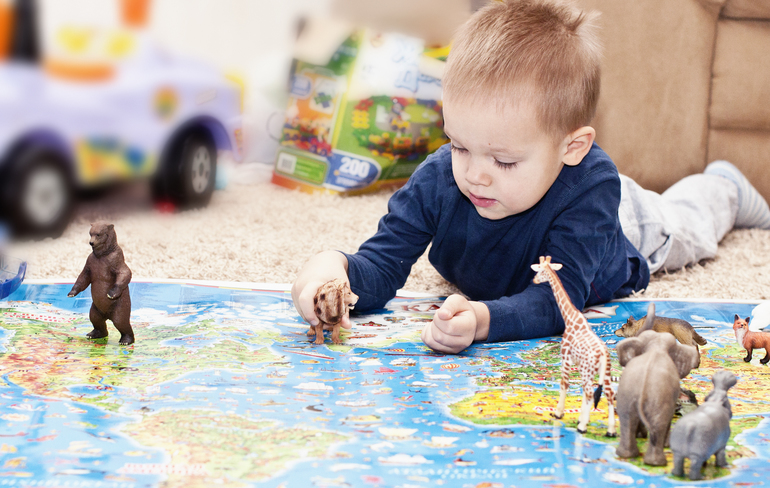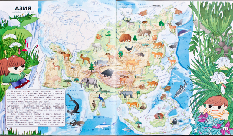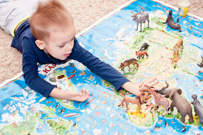 Отлично работает карта мира с изображением на ней животных в среде их обитания. С ее помощью можно также отрегулировать представления ребенка о расстояниях между странами и континентами. У нас обычная Детская карта мира, хотя у издательства, того, что переиздала атлас есть тоже карты, но цена на них значительно выше. С помощью карты мы узнали какие животные живут на различных континентах, а теперь расставляем на ней фигурки животных, чтобы закрепить материал.