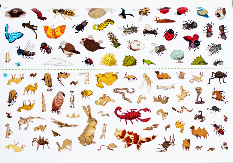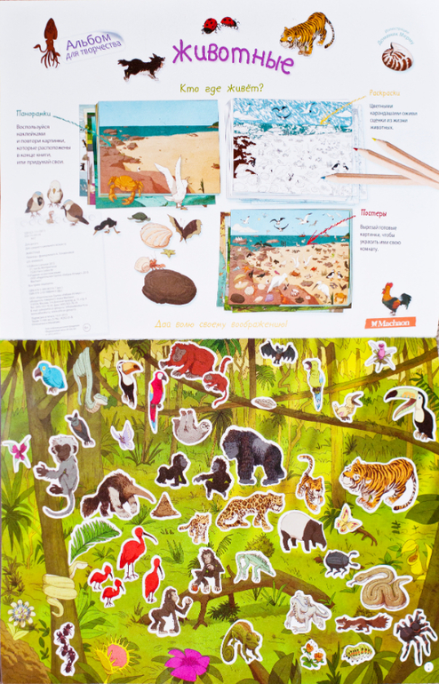 Вот уж где простор для познания и творчества! В альбоме 12 картинок-панорамок с различными средами обитания животных, а сколько наклеек! Можно повторить картинку, которая изображена на форзаце, а можно наклеить по собственному вкусу. Также есть раскраски, для любителей.