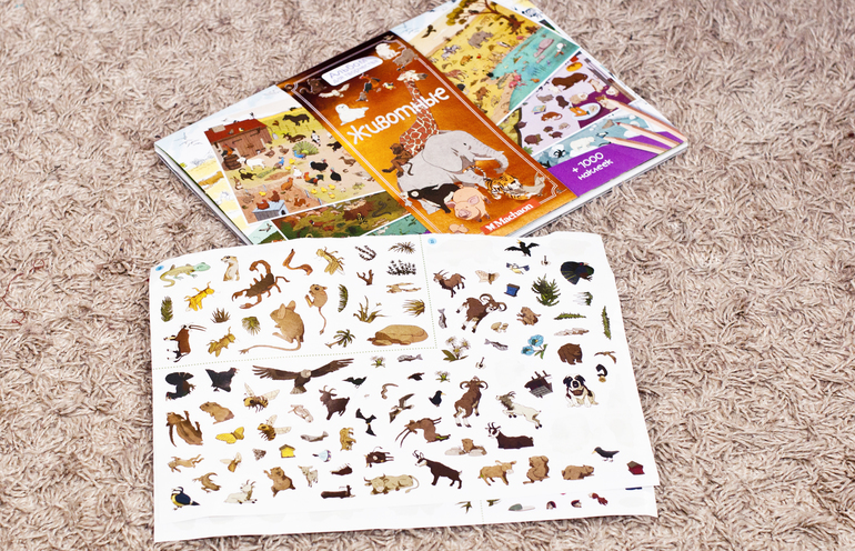 В изучении среды обитания животных нам также помогают наклейки. Например, недавно я купила «Альбом для творчества +1000 наклеек» от Махаон, серия «Животные».