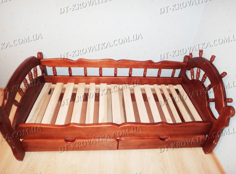 2. Кровать-штурвал натуральное дерево ясен, с ламелиями, 2 ящиками и можно заказать бортик до половины длинны, размер матраца такой же 80*190, но высота небольшая т.е. безопаснее и можно маме умостится для присыпляния. Заманчивое предложение, но там ящики для белья только, а в предидущей квровати можно и игрушки и одежку и канцтовары разместить.