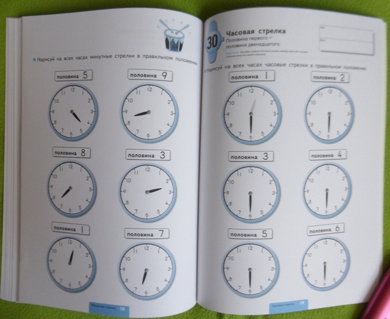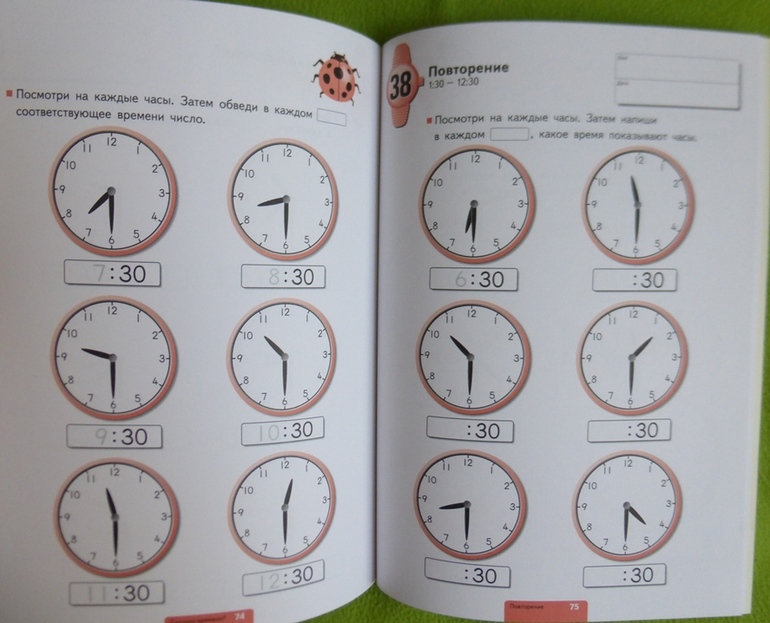 С 20-26 урок идет изучение понятия половина часа, где также вначале предлагается обводить числа, потом уже самостоятельно определить время и написать.