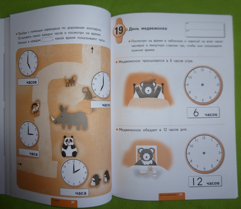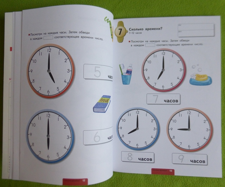 Начиная с 5 урока, ребенку предлагается обвести числа, соответствующее времени на часах, самостоятельно определить время и вписать в соответствующую рамочку число.
