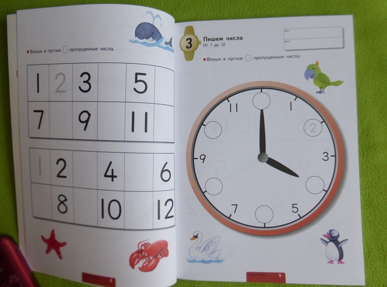 В самых первых заданиях ребенку предлагается обводить цифры от 1 до 12, далее вписать пропущенные числа на циферблате и в таблицах, далее самостоятельно уже написать числа от 1 до 12