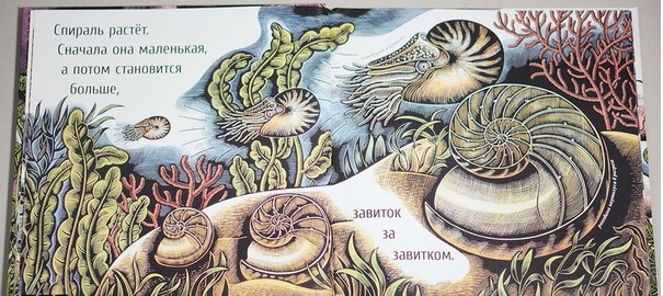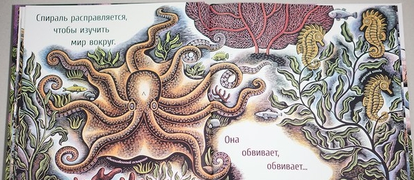 Яркие и необычные иллюстрации - это отнюдь не основная фишка книги. Хотя и это тоже, тема книги - все о спирали. Вроде бы простая вещь, а сколько интересного она может, скольким животным и растениям помогает.