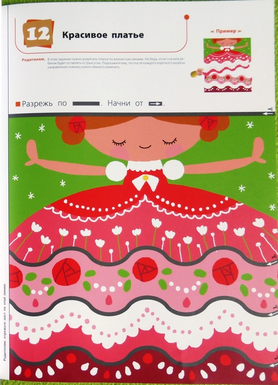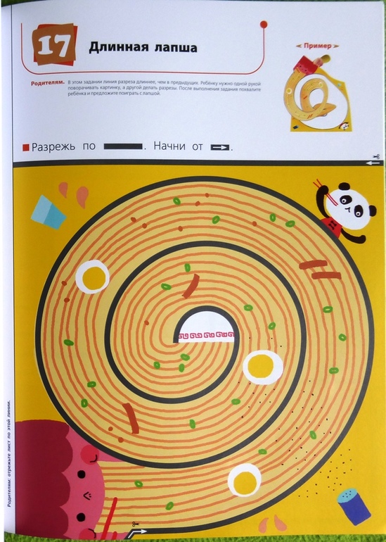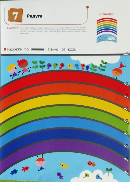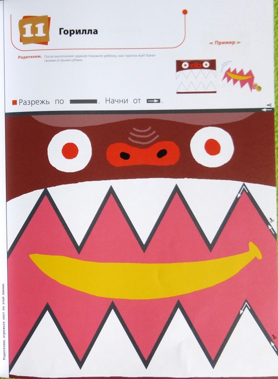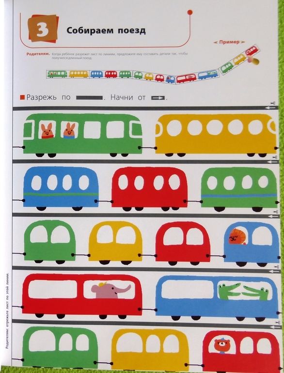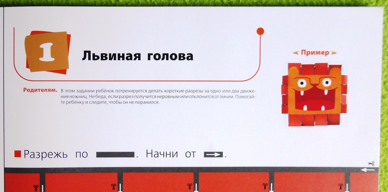 Всего в тетрадке 31 задание. В этой тетради ребёнку сначала предстоит научиться правильно держать ножницы и делать ими прямые разрезы. С каждым новым упражнением длина разрезов будет увеличиваться, а навыки ребёнка совершенствоваться, что позволит ему перейти к разрезанию картинок по изогнутым и ломаным линиям, а также вырезать фигуры более сложных форм. Постепенно пальчики ребёнка окрепнут, и он сможет хорошо контролировать движения ножниц.