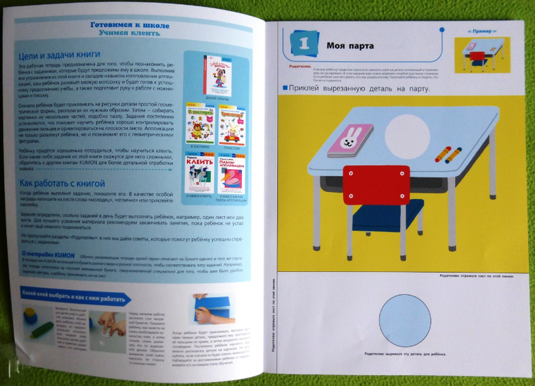 Выполняя задания из тетради Учимся клеить, ребёнок научится наносить клей, аккуратно приклеивать детали аппликации и собирать картинки из нескольких частей, как пазл, что будет способствовать развитию мелкой моторики рук и пространственного мышления ребенка.