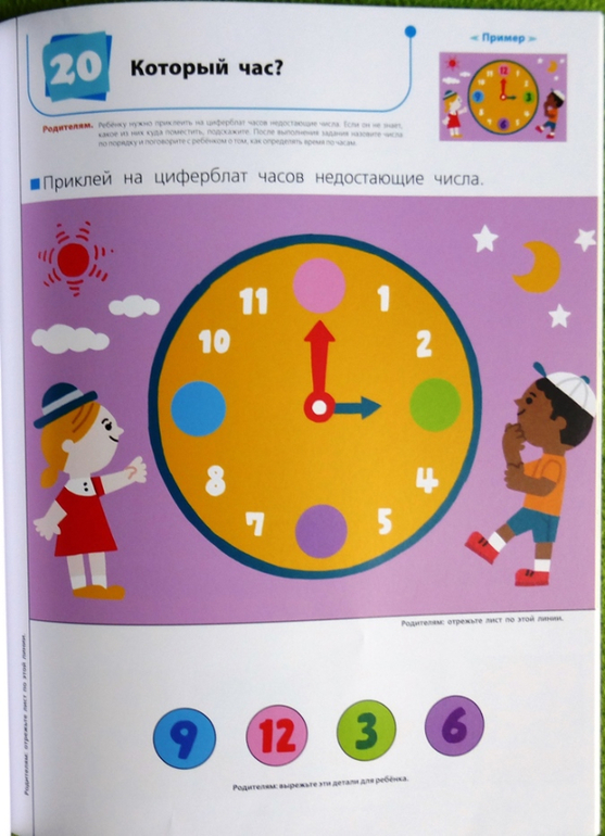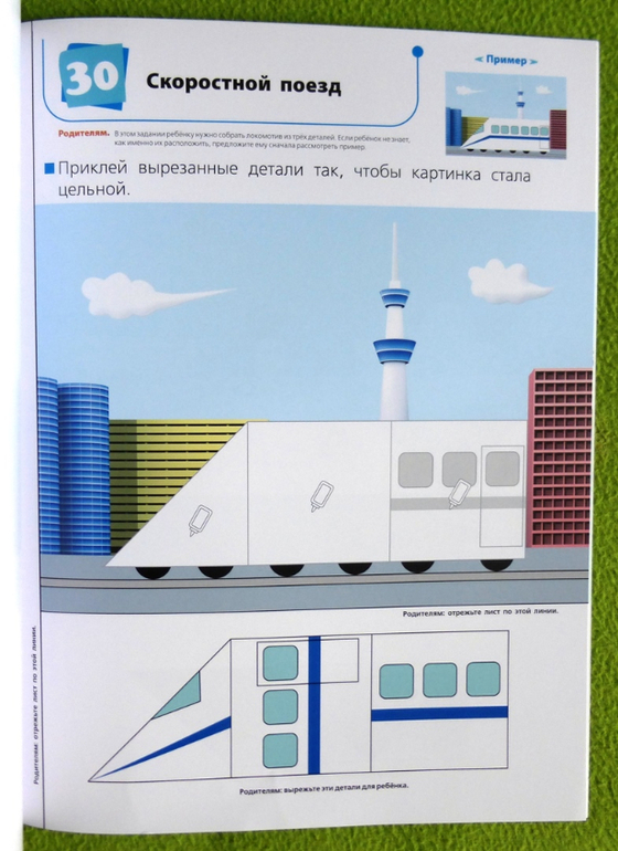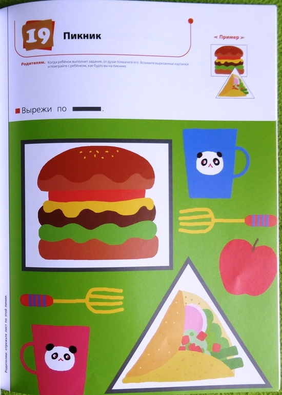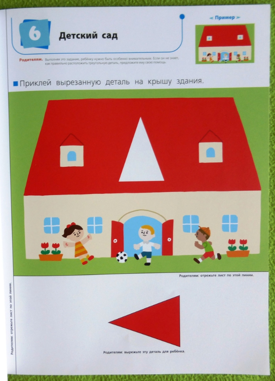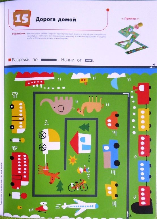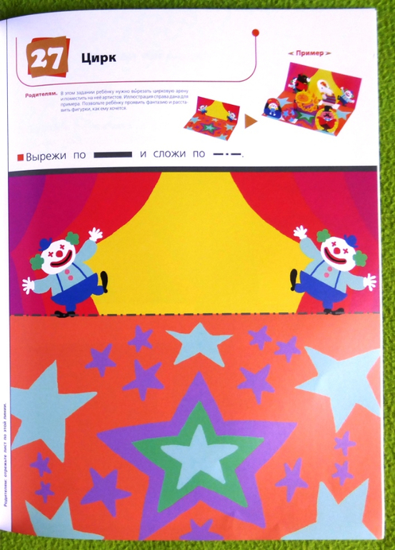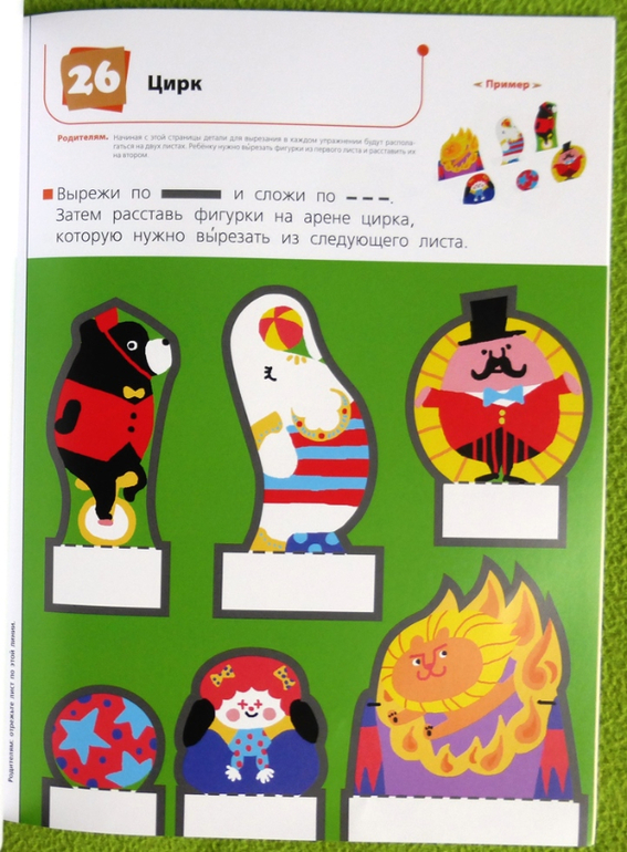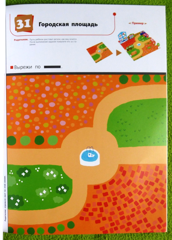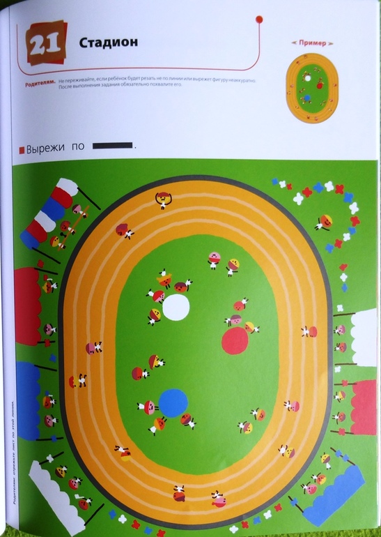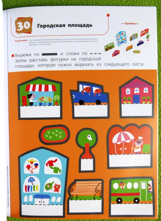 В конце тетрадки очень забавные задания на вырезание предметов сложных форм с которыми в последствии можно играть. Например, предлагается вырезать арену цирка и персонажей, детскую игровую площадку с качелями и горками или городскую площадь с домами, транспортом и жителями городка