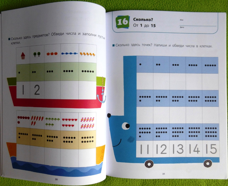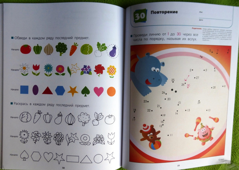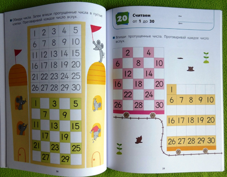В третьей - считать количество предметов и точек и вписывать соответствующие числа в пустые клетки таблицы. Эти задания отлично тренируют навыки порядкового счёта и письма.