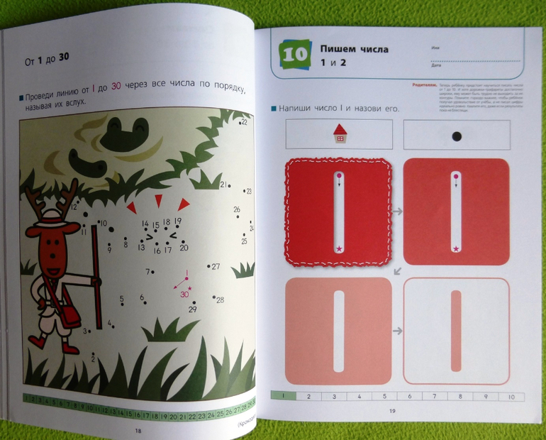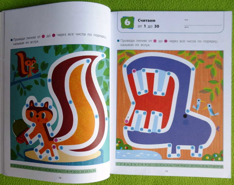 В первой части этой тетради ребёнку предстоит сначала соединять линией числа по порядку называя их вслух о 1 до 30. Первый десяток у дочек давно доведен был до автоматизма еще когда им и 3-х лет не было, а вот задания на третий десяток для нас очень актуальны сейчас.
