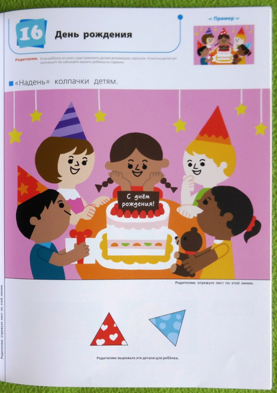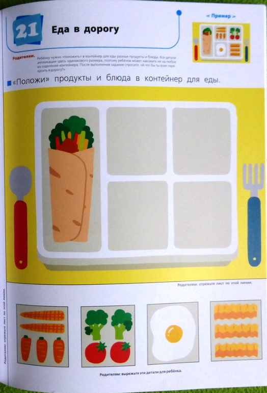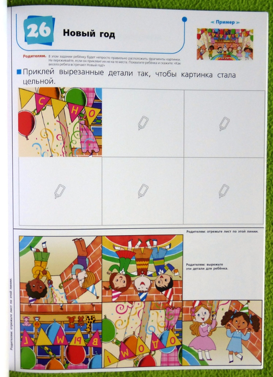 Ребенку вначале предстоит приклеивать на рисунок однотонную деталь простой геометрической формы. Затем - деталь с рисунком, поворачивая её так, чтобы узор на ней совпал с узором на основной картинке. После этого ребёнок будет приклеивать на картинку несколько деталей, выбирая для каждой из них подходящее место. В последующих заданиях ребёнку нужно дополнить картинку недостающими деталями пазла. В заключительной части тетради предлагаются упражнения на «собирание» не всей картинки, а одного её объекта из нескольких частей. Работа с клеем и аппликациями не только развлечёт ребёнка, но и познакомит его с геометрическими фигурами, также можно закрепить тему «цвета».