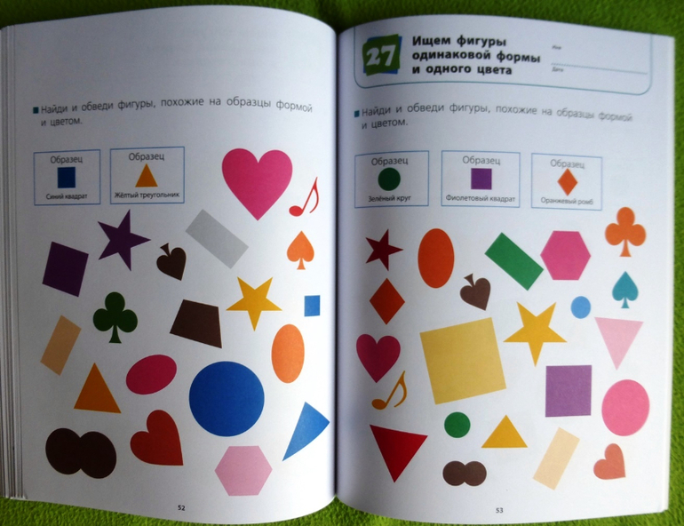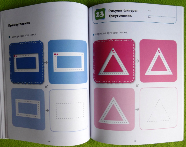 Четвёртая часть тетради знакомит ребёнка с простыми геометрическими фигурами: кругом, овалом, квадратом, прямоугольником, треугольником и ромбом.