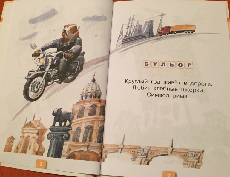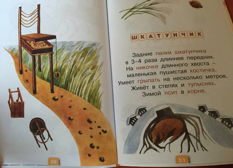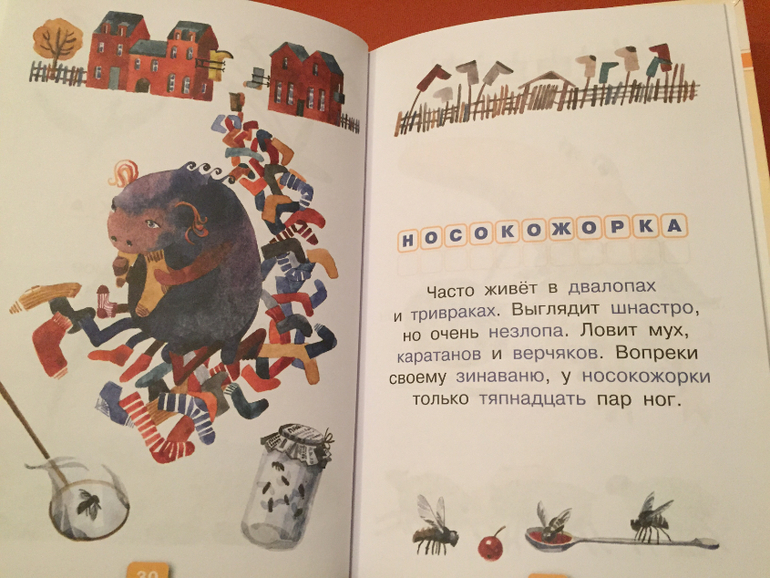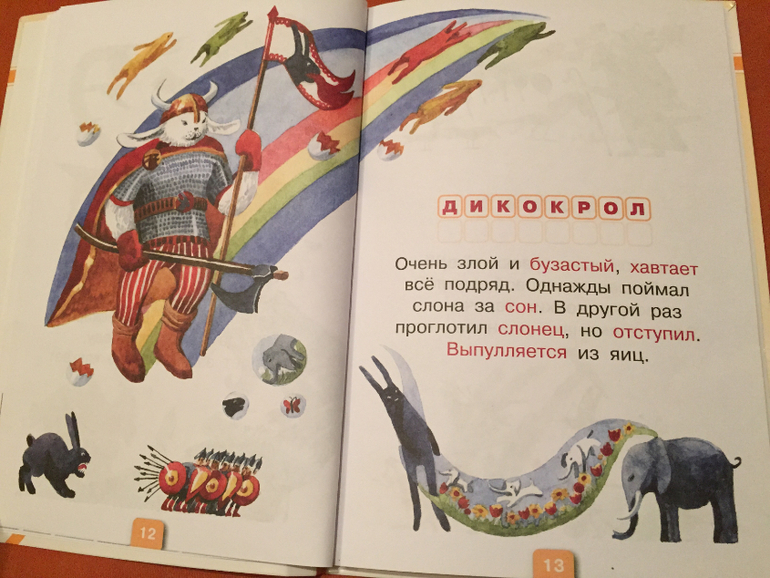 Разворот посвящен одному животному. Рядом с текстом расположены рисунки. Некоторые могут упростить разгадывание, другие являются просто забавными иллюстрациями, изображающими Дикокролов и Тонкоусов.