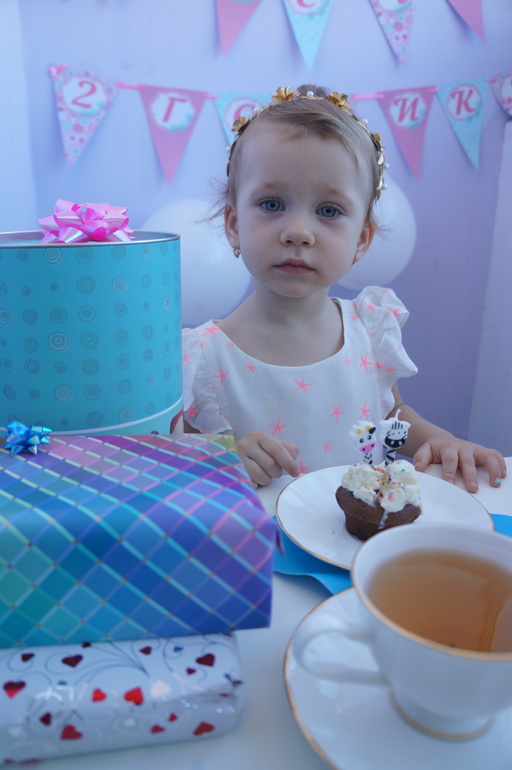 С утра 30го (а утро у нас это 10:30) я испекла ее любимые кексики, надула шарики, приготовила подарочки, повесила растяжку, нарядила девочек и в 13:30 (в это время она родилась) мы задули свечи!