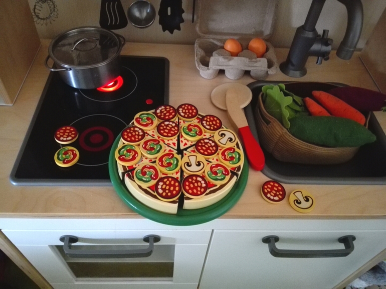 Открыли подарочки. От моей мамы пиццу деревянную Melissa & Doug, яица деревянные и кинетический песок ( нужно было обновить))). Это конечно не основные подарки были, основные отложили на следующий день)))