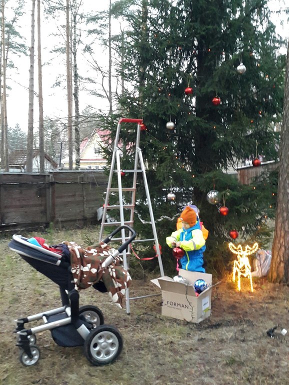 Даже три елки. Самую первую елку мы наряжаем на улице. Наша красавица с каждым годом становится все выше и больше, пришлось даже докупить гирлянд и игрушек для нее в этом году.