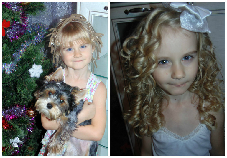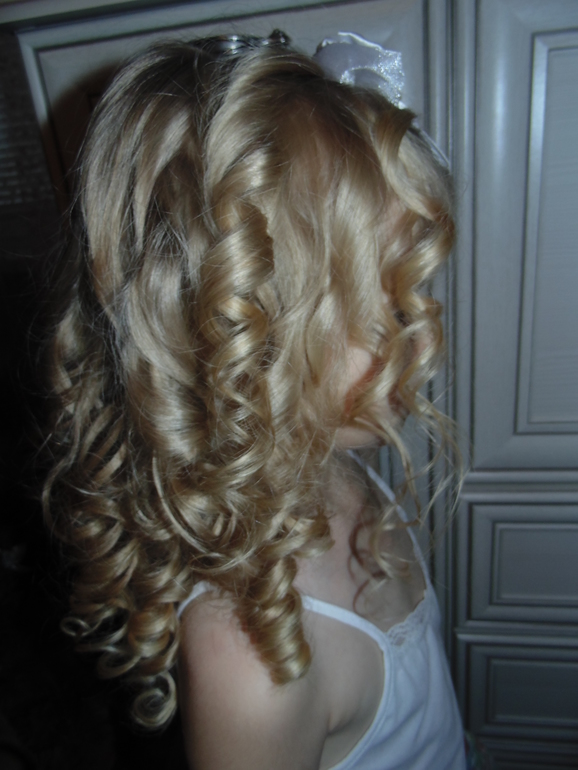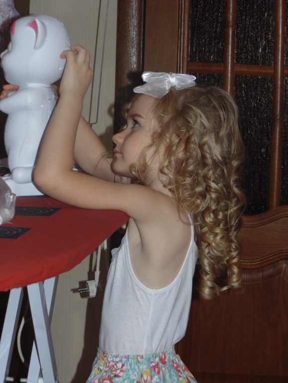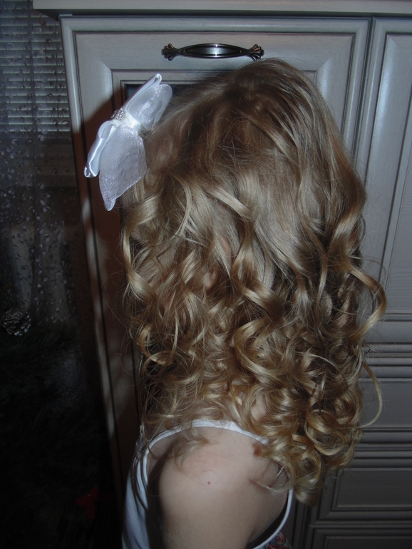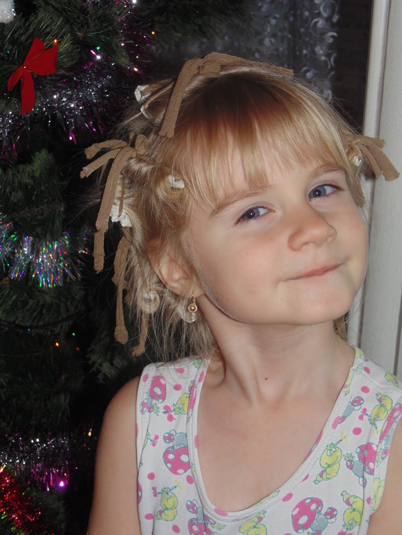 Парик розовый у нас уже был на утреннике , в яслях ещё ))) ... решили попробовать накрутить волосы ) . И тут , как говорится , мама вспомнила "детство" ))) ... на плойку или утюжок накрутиться было нереально , всё разъезжалось ((( ... тогда в ход пошли подручные матерьялы из " молодости " ))) - а именно колготы и бумага ))) !!! Так у нас смастерились бигуди , на которых реально спать ))) ... Делали их полвечера ( Стеша помогала ))) ), так как волос у нас , оказывается , не мало ) . Что у нас получилось , смотрите подкатом ( о самом утреннике , следующий пост ) :