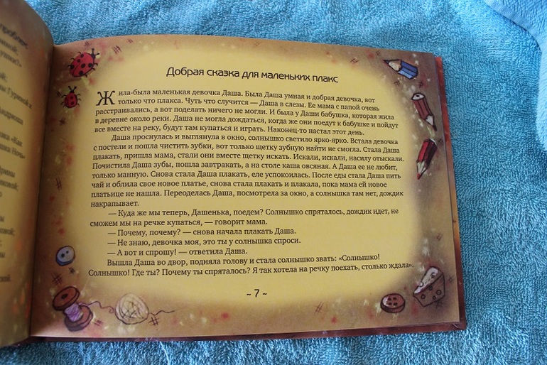 Это не та книжка, которую нужно каждый вечер читать запоем. Вообще, в сказкотерапии важен правильный подход. Из моих наблюдений, лучше делать так: сначала прочтите обычные вечерние книги, обсудите, полистайте… А на десерт возьмите «» (ну, или «Сонные сказки», или еще что-то из серии, может, "Сказки от слез") и прочитайте только одну, самую актуальную. Непременно обсудите ее - что произошло с персонажем, что им двигало, какие мотивы, как изменилась ситуация, все ли кончилось хорошо и почему… Не стесняйтесь задавать вопросы.