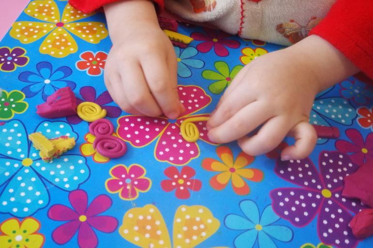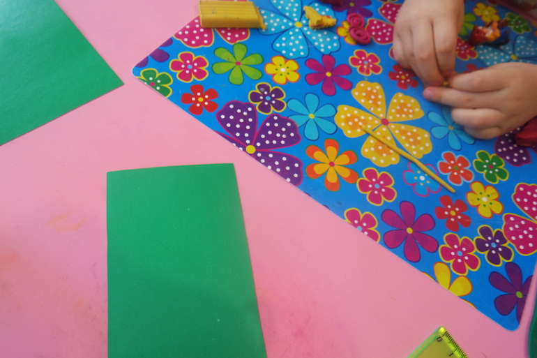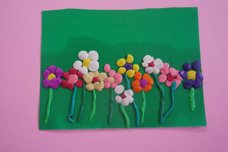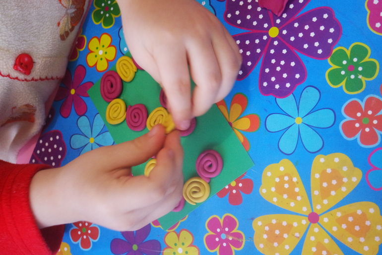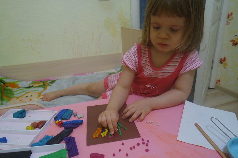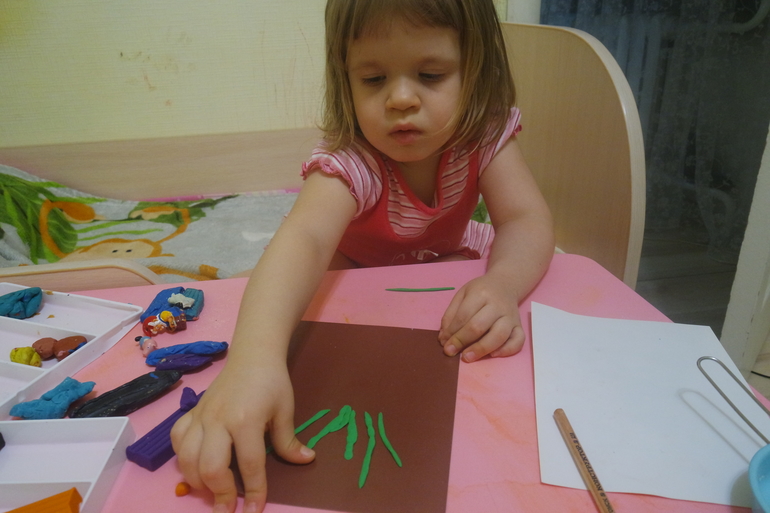 На картоне я нарисовала силуэт вазы. Лиза отлично работает с пластилином.