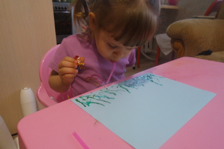 Рисуем травку. Выдуваем капли краски с помощью трубочки.