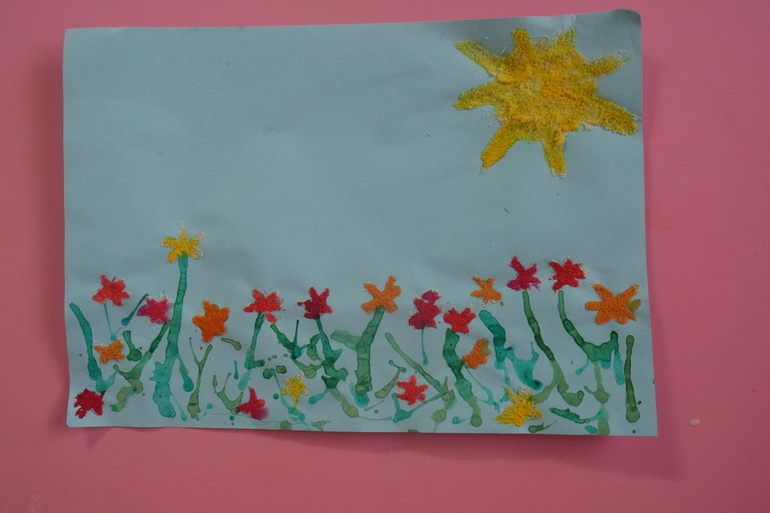 Рисуем клеем цветочки и солнце, посыпаем манкой . Когда клей подсох, покрасили цветы гуашью.