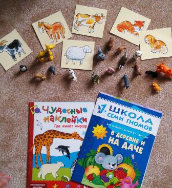 Сыну понравилось и он попросил что-нибудь еще со зверями. Я предложила поискать животных. В книге Школы Семи Гномов "В деревне и на даче", открывали разворот на ферме. Задача состояла в том, чтобы найти определенного животного и положить туда или карточку или животное. Сын клал и то и то, если было))))