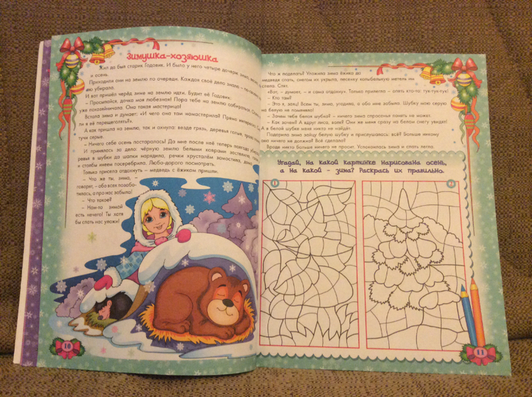 После сказок даются разные задания. Где-то нужно раскрасить. Где-то решить головоломку. Знаю, что некоторые родители не разрешают своим детям рисовать в книжках (даже если в книге нужно рисовать), а я просто учу с раннего детства, что есть книги, в которых можнон вырезать картинки, есть книги, в которых можно рисовать. И в этой книге Никита сразу понял, что нужно разукрасить картинки)