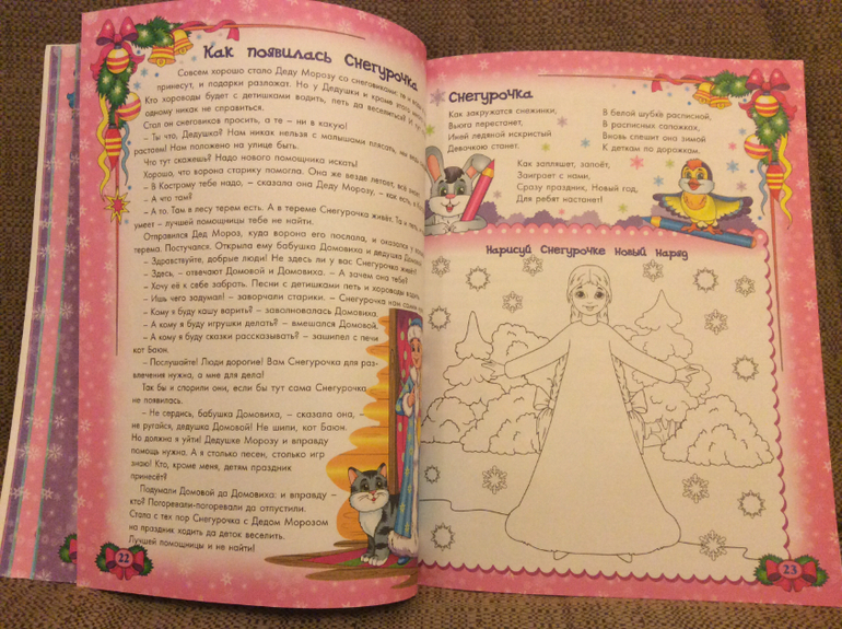 Книжка необыкновенно милая и праздничная. Правда с качеством печати не очень, листы тоненькие, обложка глянцевая и тоже тонкая. Ребенок может нечаянно порвать странички, так что аккуратно и сыну с собой в сад я эту книжку не дам, боюсь за сохранность. Только если в руки воспитателя и под ответственность воспитателя.