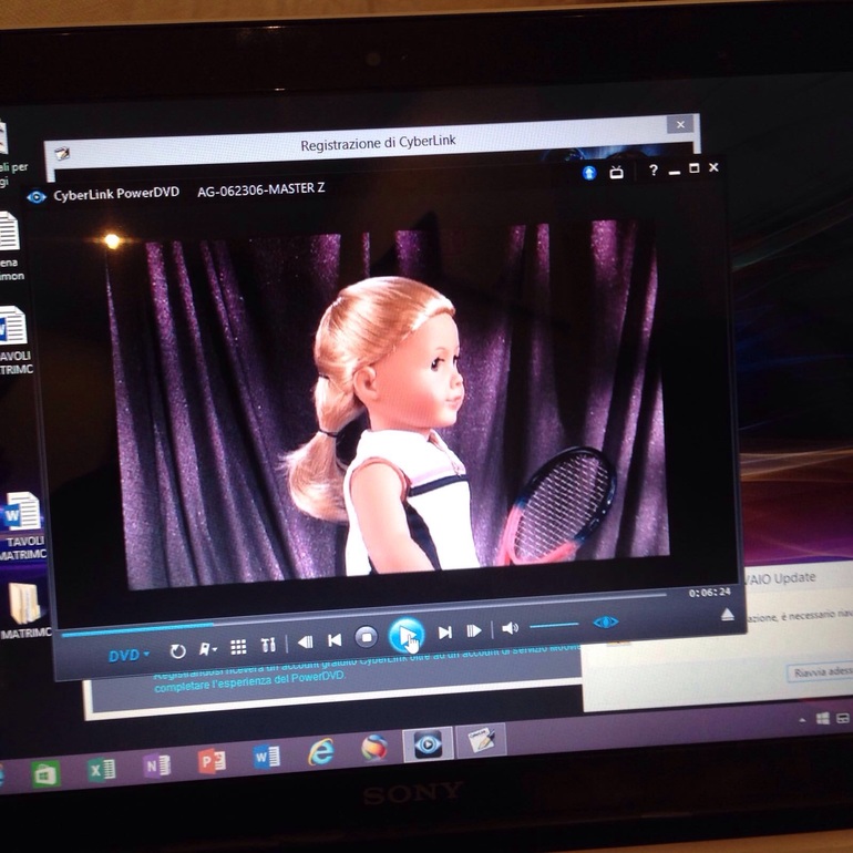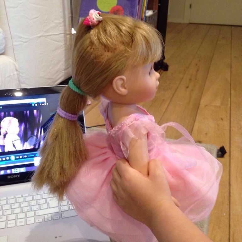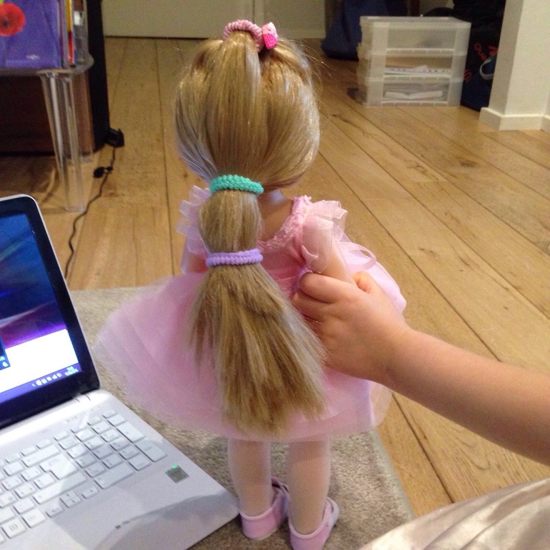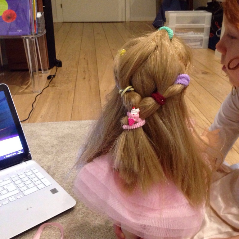 4) играем в парикмахерскую .. Всем куклам с длинными волосами дочка учится делать причёски ( здесь на компьютере диск с прическами и дочка их повторяет )