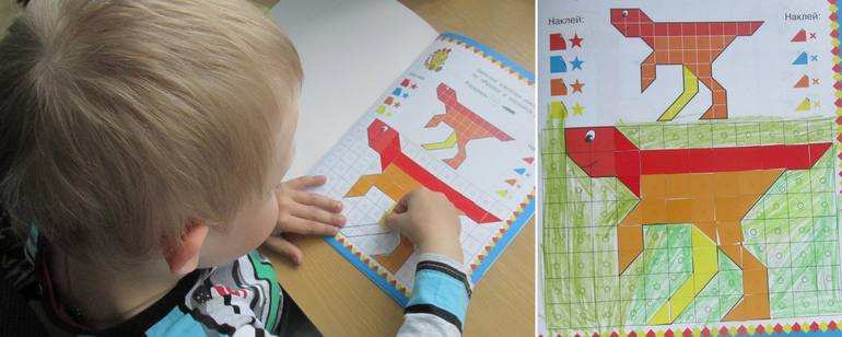 3 день - у нас был графический диктант "Нарисовать динозавра". Я говорила, сколько надо пройти направо, вверх, вниз или влево, а сын "рисовал" потихоньку динозавра. За один день мы нарисовали первого динозавра, а на следующий день сын захотел и второго нарисовать.