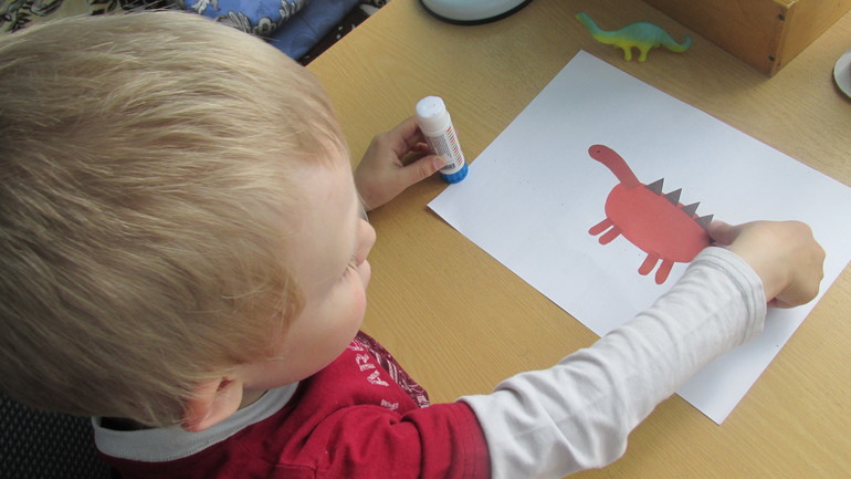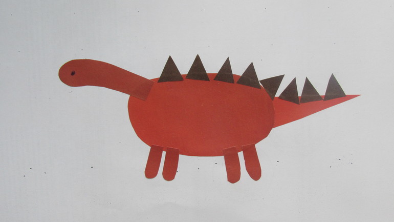 - ну, и наконец приклеиваем детали и собираем целый рисунок динозаврика
