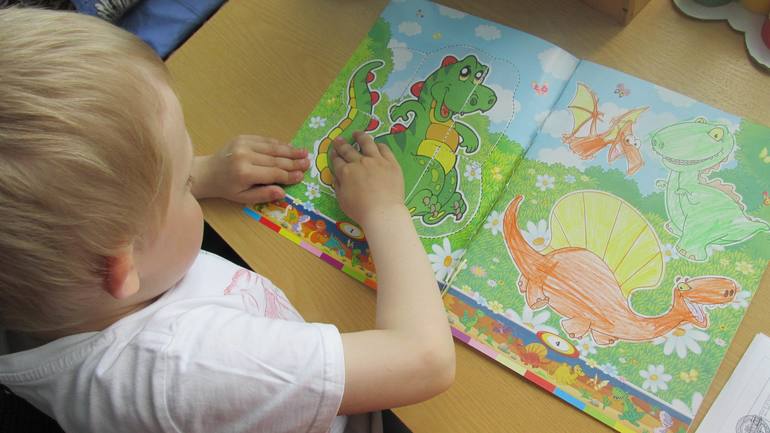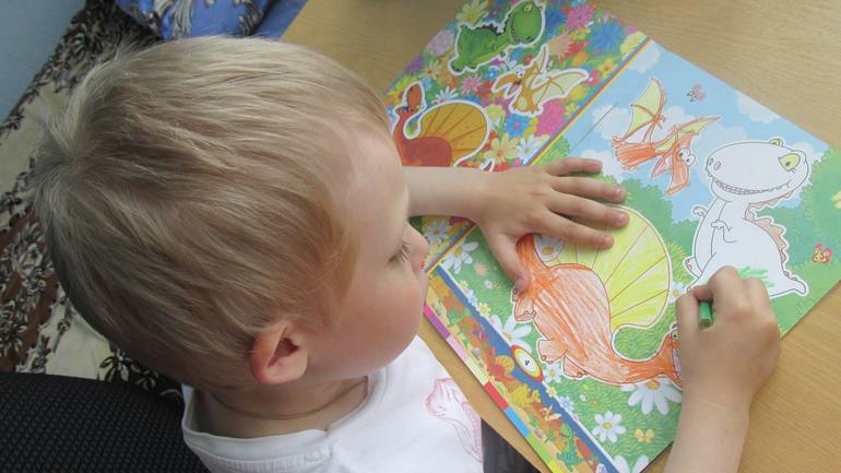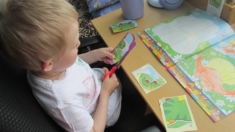 1 день - Я одела Максиму футболку с динозаврами и выдала ему очередную книжку с раскрасками, пазлами-аппликациями (он просто обожает такие ):