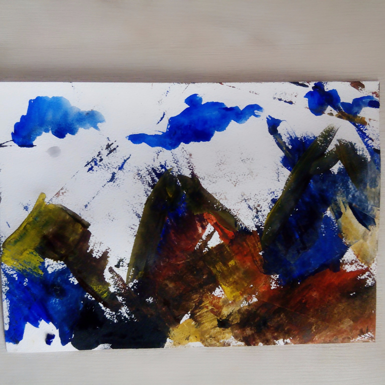 И теперь ни как не можем остановиться, рисует почти каждый день, сам просит хотя до этого инициатором часто была именно я. Я стараюсь находить интересные задания, чтобы разнообразить его рисование. Два я нашла на сайте Школы Семи Гномов. Итак первое рисование линейкой, рисовали гуашью пятно и растягивали его линейкой, делая таким образом горы.